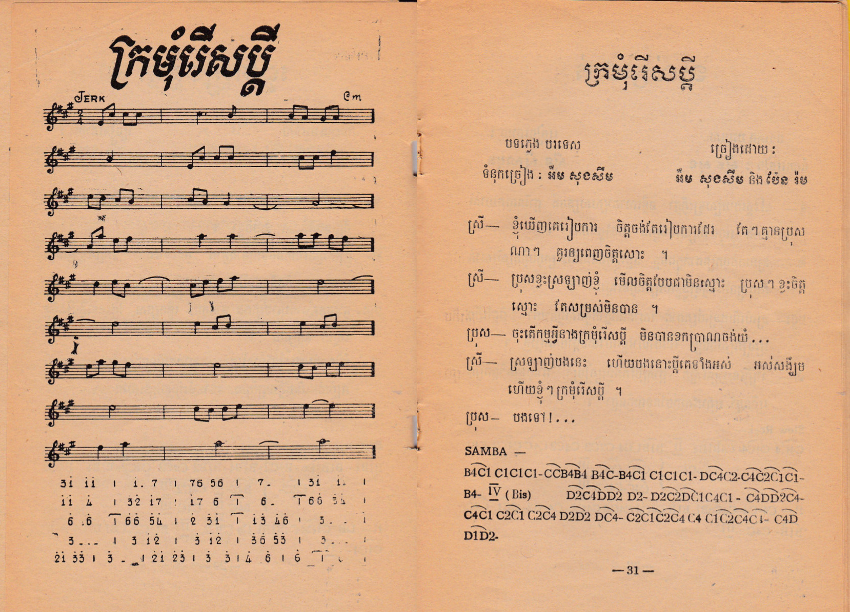 Many thanks to Nate Hun of the Cambodian Vintage Music Archive for catching error in the original post. He has also sent the sheet music and lyrics for the song above.